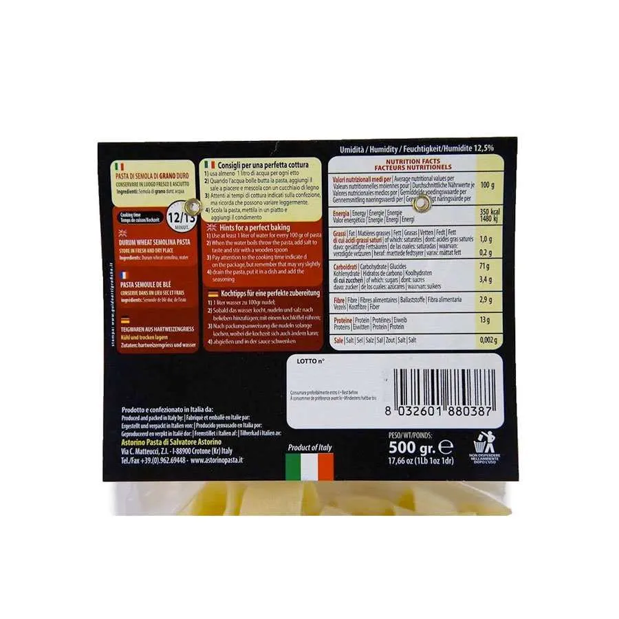 Ingredienti: Semola di grano duro 100% italiana e acqua Il prodotto non contiene: Additivi/O.G.M.