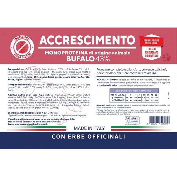 Questo tipo di carne fornisce una monoproteina ipoallergenica che non è mai stata utilizzata prima nell’alimentazione dei cani. In questa formula, è stato seguito il concetto di alimentazione olistica che caratterizza tutta la linea Vet Line, utilizzando solo carne di bufalo fresca, disidratata e idrolizzata, e una fonte di carboidrati priva di glutine allergizzanti e lieviti. Inoltre, è integrata con sei erbe officinali titolate che aiutano a prevenire parassiti, infezioni batteriche e virali, e disturbi digestivi.
