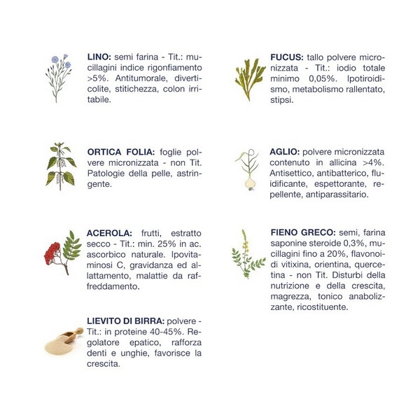 - favino, semi di lino, olio di pesce, polpa di barbabietola essiccata e erbe officinali (0,5%) come lino, ortica folia, fieno greco, lievito di birra, acerola, fucus e aglio