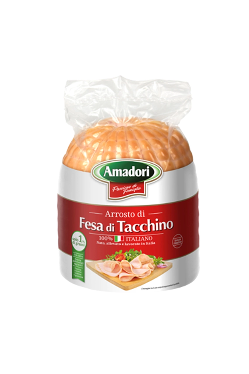 La linea della Fesa di Tacchino Amadori arrosto di tacchino è ottenuta con carni 100% italiane, senza glutine, senza polifosfati aggiunti.