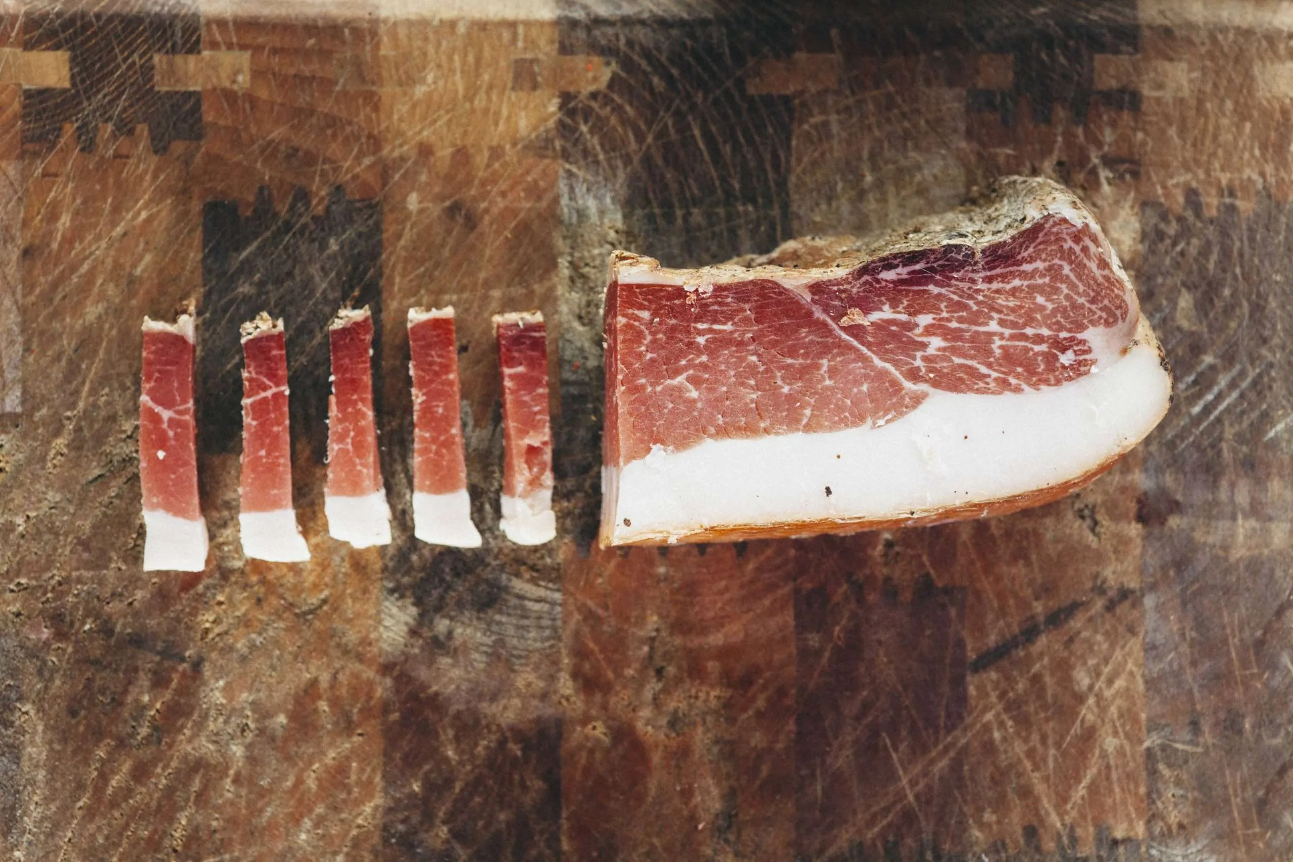 Il nostro speck al naturale viene prodotto con una parte della coscia del suino trentino, viene prodotto senza nessun tipo di conservante, speziato, affumicato con faggio e ginepro e stagionato per minimo 12 mesi.