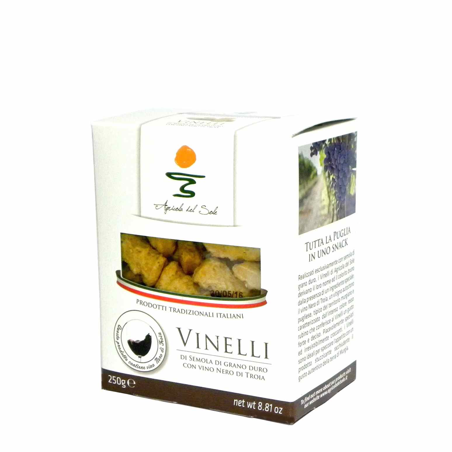 The Vinelli are entirely made with Remilled durum wheat semolina. Their name and their amber color derive from Nero di Troia, an autochthonous grape variety from Apulia. The ruby red wine gives them a full-bodied taste.