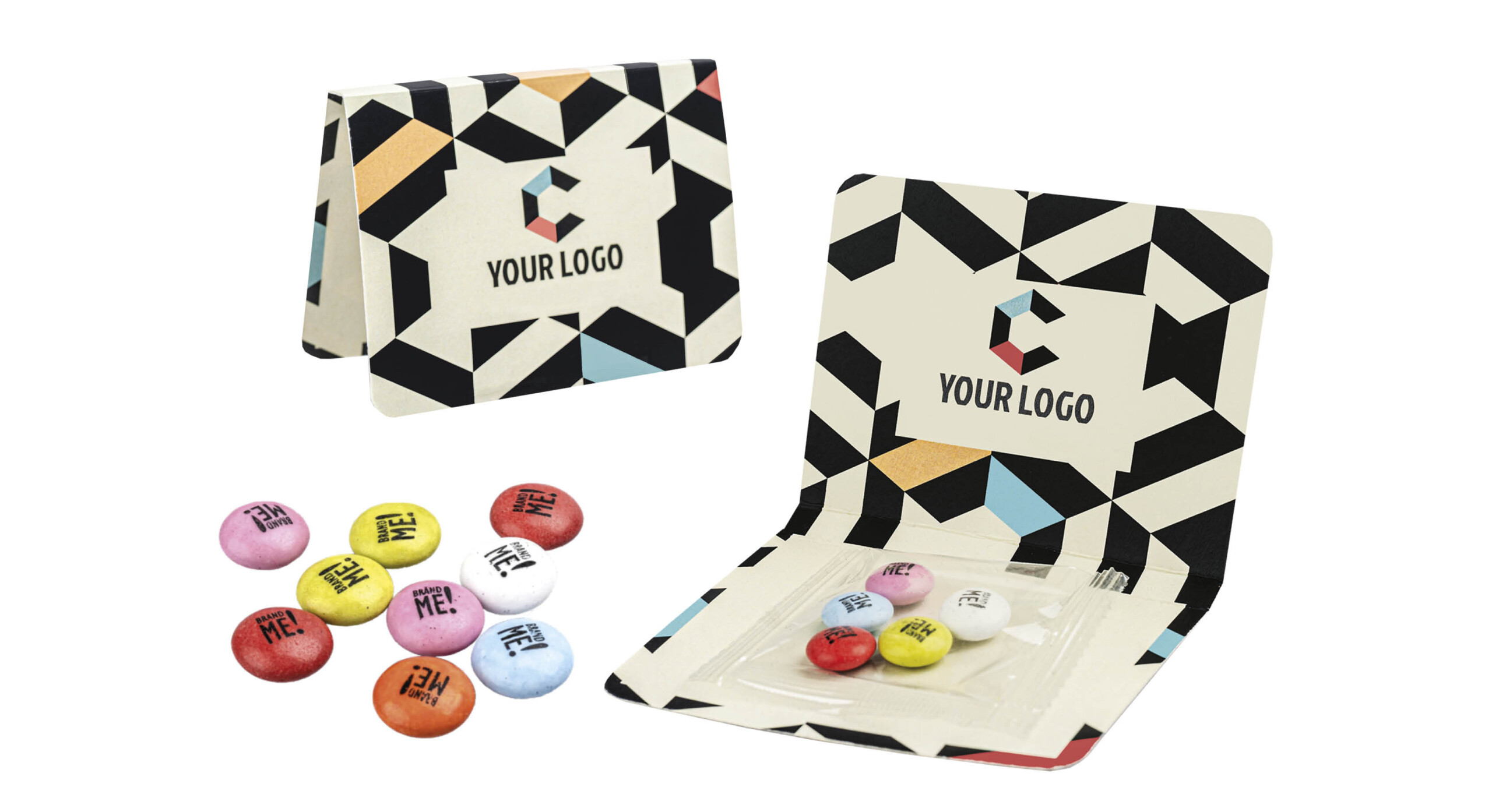 Cartolina in cartoncino personalizzato in quadricromia f.to 99x74x10 mm. Contiene riposizionata al suo interno una bustina polybag trasparente neutra con 5 lenticchie di cioccolato al latte ( solo misto colori casuale) personalizzate ad 1 colore fronte e retro (stampa solo in nero). Durata 6 mesi idal confezionamento. Minimo pz.500. Consegna ca 20/25 gg da approvazione bozza
