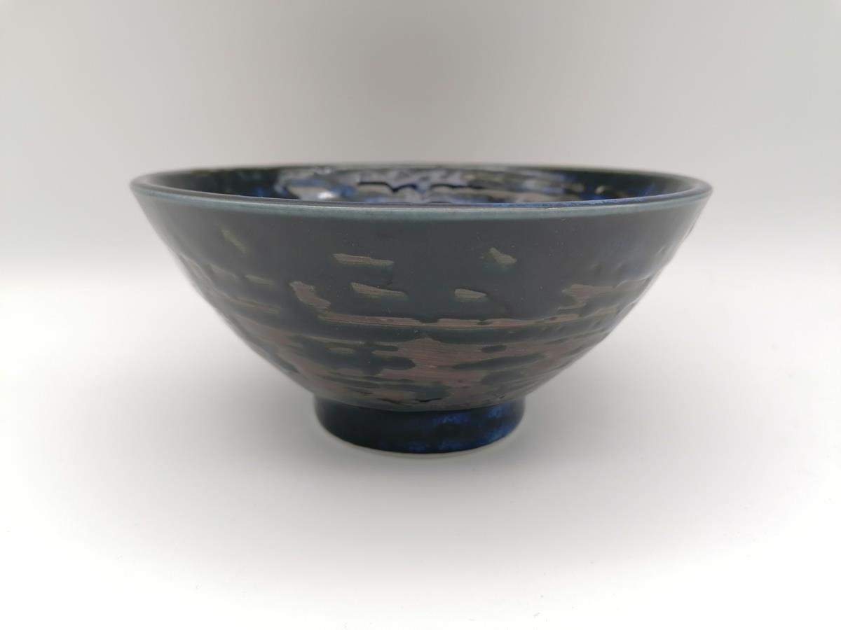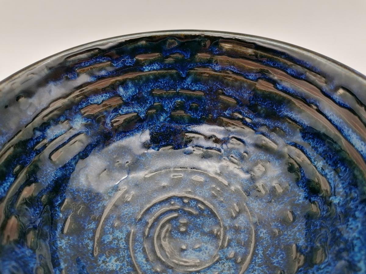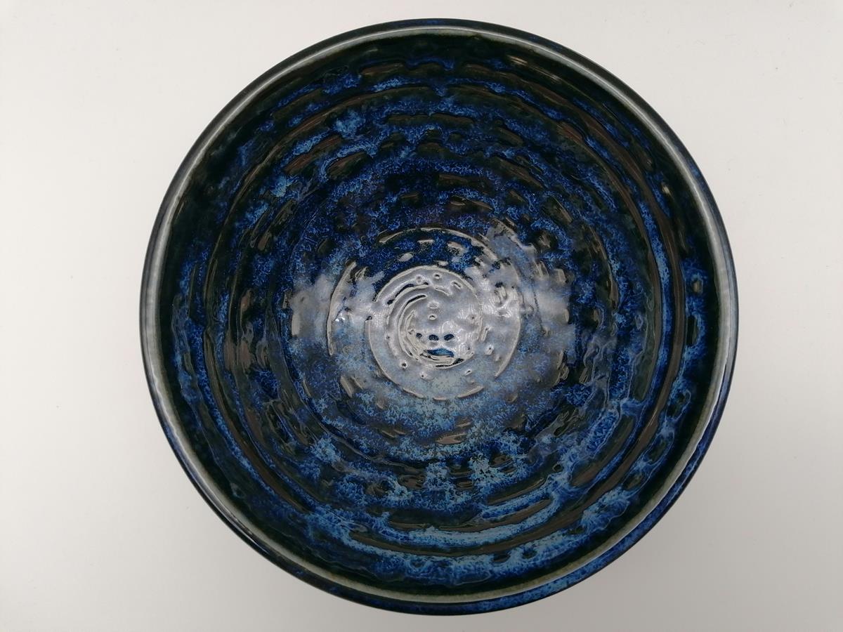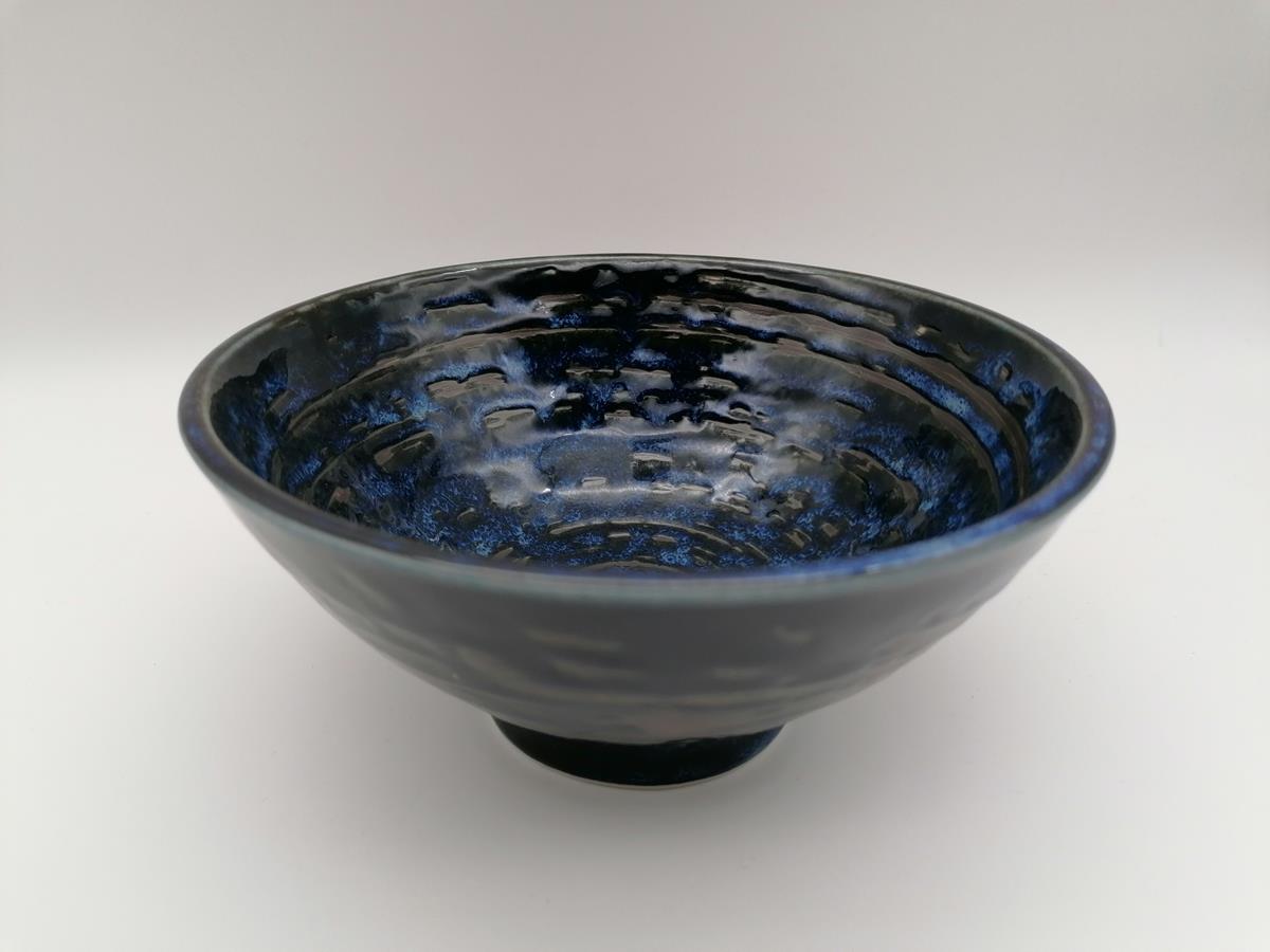 Bellissima ciotola artigianale per da domburi, in ceramica giapponese di colore blu con spirali nere.