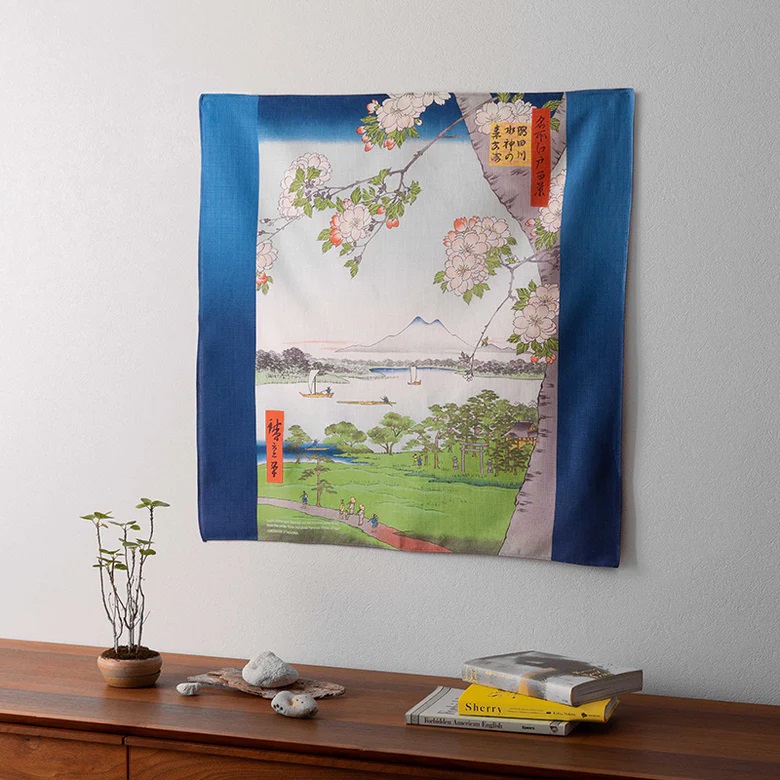 Questo furoshiki rappresenta una stampa Ukiyo-e tratta dalle “Cento vedute famose di Edo” di Hiroshige Utagawa, una collezione che influenzò in maniera significativa i pittori occidentali, soprattutto Vincent van Gogh.