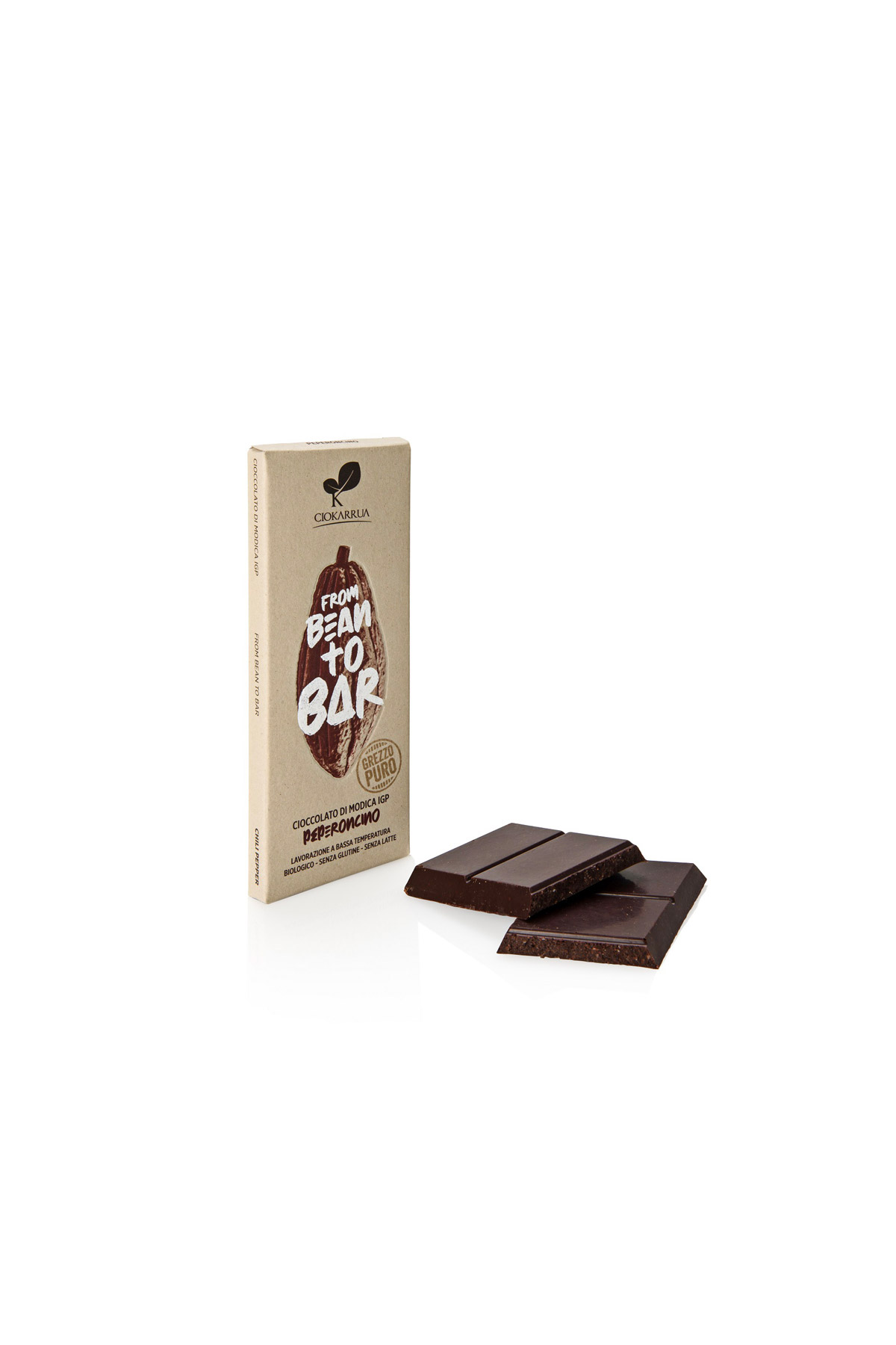Per questa tavoletta abbiamo scelto di abbinare un fondente minimo 70% con un peperoncino italiano biologico, senza l’utilizzo di aromi naturali.