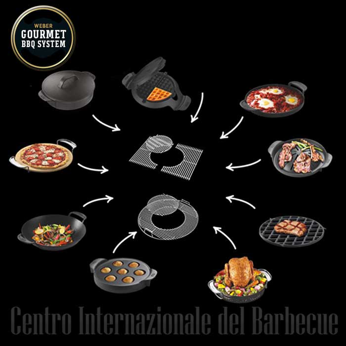Griglia in filo d’acciaio inox, con centro staccato e asportabile, in modo da permettere l’utilizzazione di tutti gli accessori gourmet, e di continuare il grill lungo il bordo. Adatto a tutti i modelli a carbone con ø 57 cm.