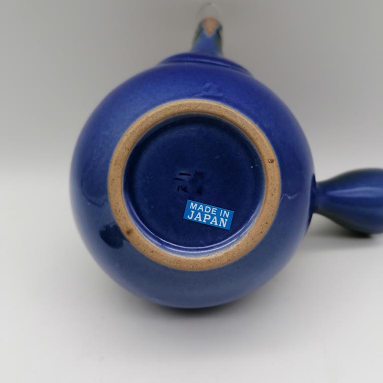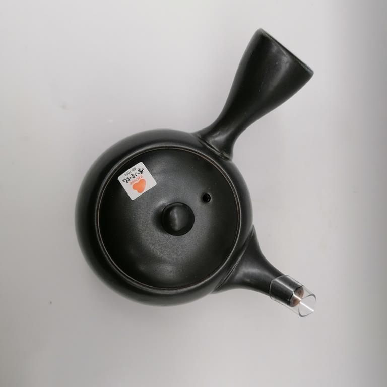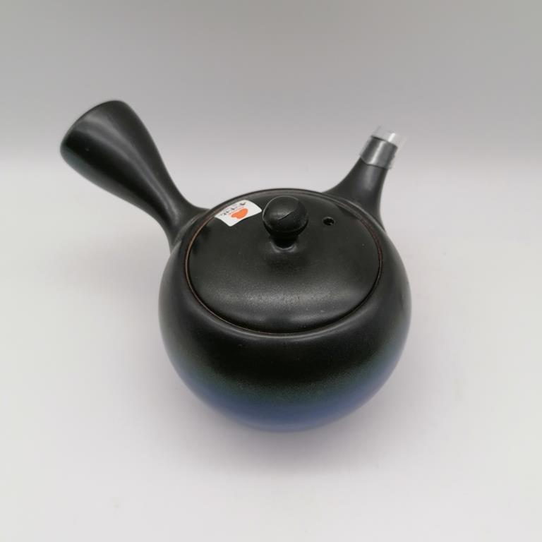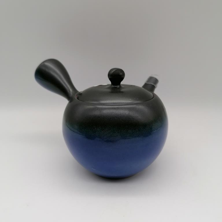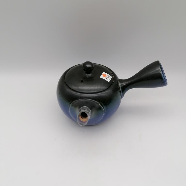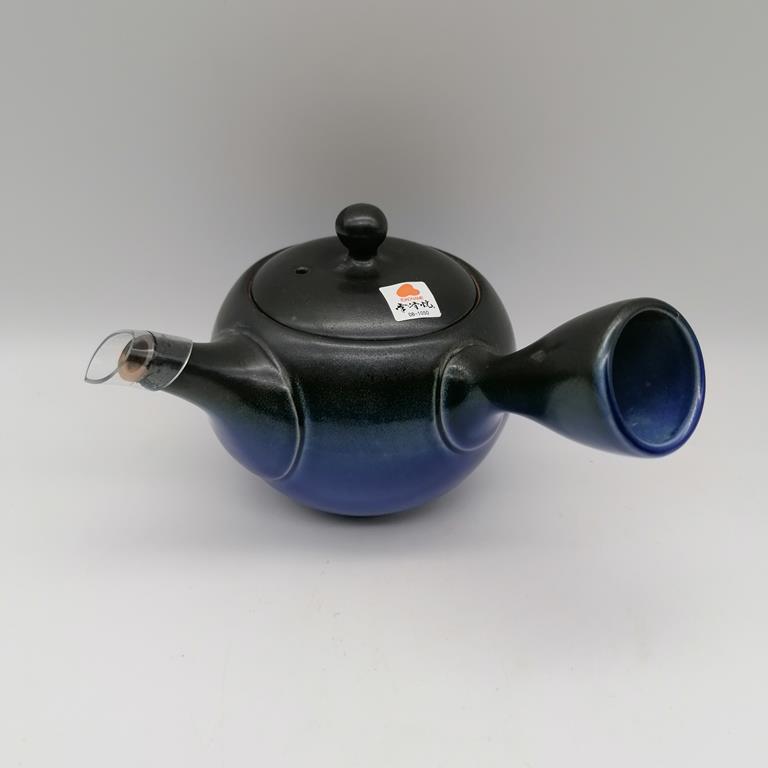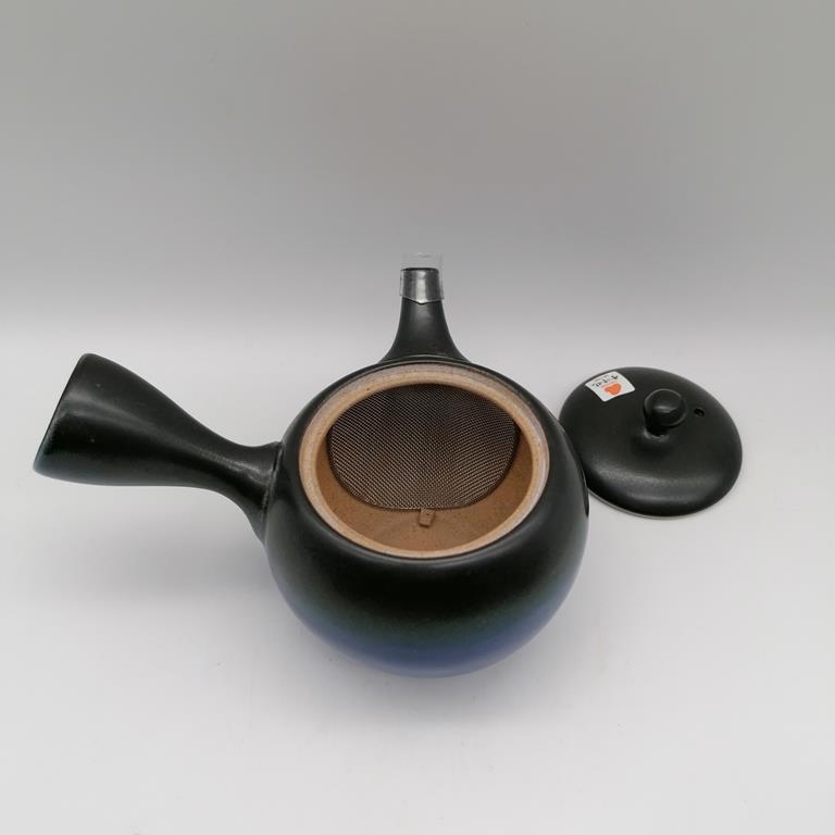 Questa kyusu è in ceramica naturale grezza decorata con smalto nero e blu ad essetto sfumato. La teiera, semplice ed elegante, è uno splendido esempio della essenzialità e della raffinatezza dell’artigianato giapponese. Il filtro in fine maglia d’acciaio è posizionato all’interno alla base del beccuccio, in modo da renderne pratici l’utilizzo e la manutenzione.