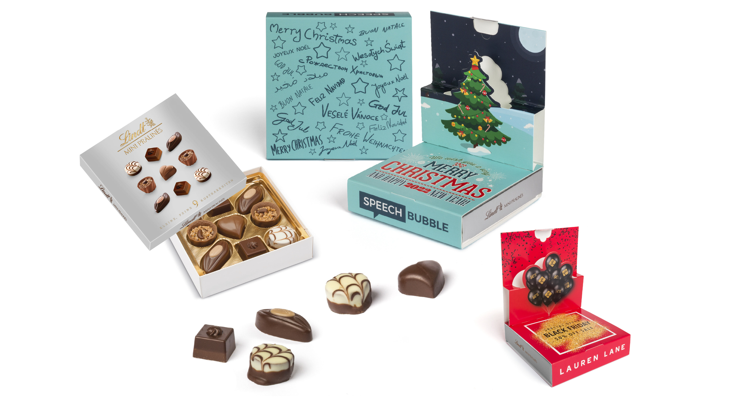 Elegante scatola in cartoncino con fascia scorrevole e pop up di apertura disponibile in 3 sagome: bolle, vignetta, albero Natale, fascia personalizzata in quadricromia mm 101x101x30. Contiene 9 golose praline vari gusti assortiti torrone, nocciola, mandorla con caramello, latte con croccante, tartufo allo champagne, del marchio Lindt. Cadauna scatola ca 44 gr. Scadenza 4 mesi dal confezionamento. Consegna ca 25 gg da approvazione bozza