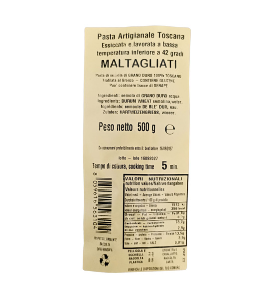 Pasta artigianale toscana essiccata e lavorata a bassa temperatura inferiore a 42 gradi.