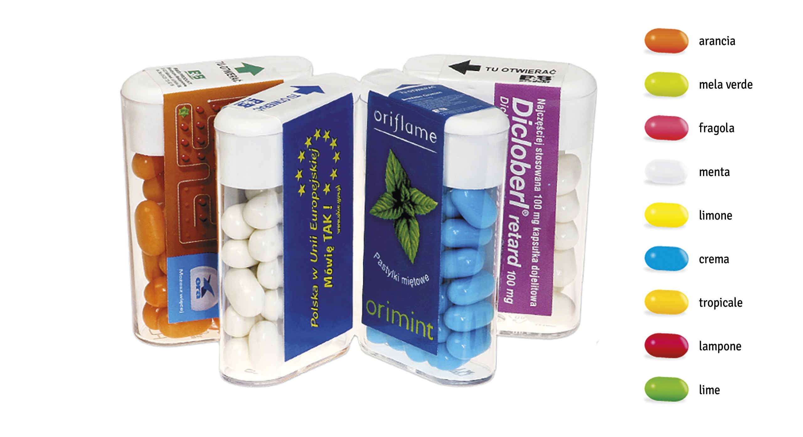 Scatolina rettangolare in plastica trasparente con tappo a scatto bianco 60x40x15 mm. Personalizzata con etichetta in quadricromia. Al suo interno contiene 20 gr. confetti mins alla menta o frutta in unico colore o misto. Minimo 500 pezzi. Data scadenza 12 mesi. Consegna ca 20 gg da approvazione bozza