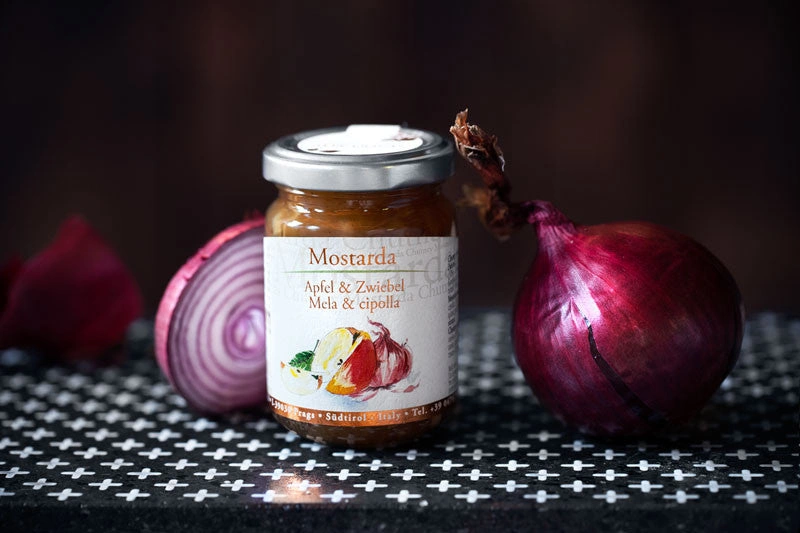 Questa mostarda di frutta a base di mele mature raccolte a mano, un po’ di zucchero, cipolla tritata, una spruzzata di aceto di vino, aglio, pepe, e un pizzico di cannella e anice stallato è ottima servita con formaggio di montagna o pecorino ben stagionato e carni lesse.