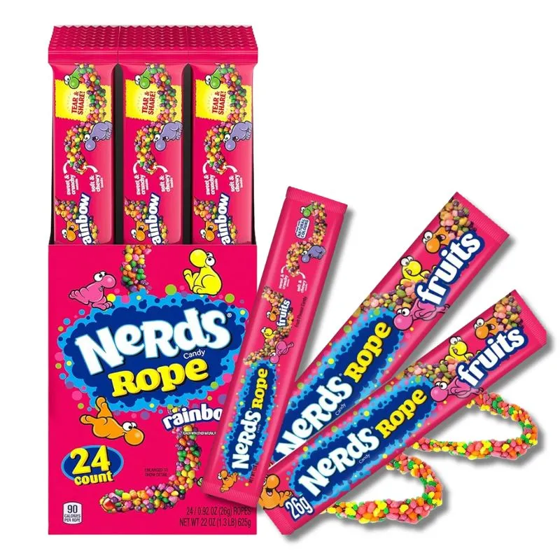 Le irresistibili Nerds Rope Fruits uniscono un cuore gommoso fruttato ricoperto da mini caramelle Nerds coloratissime: un’esperienza unica da mordere e gustare ovunque.