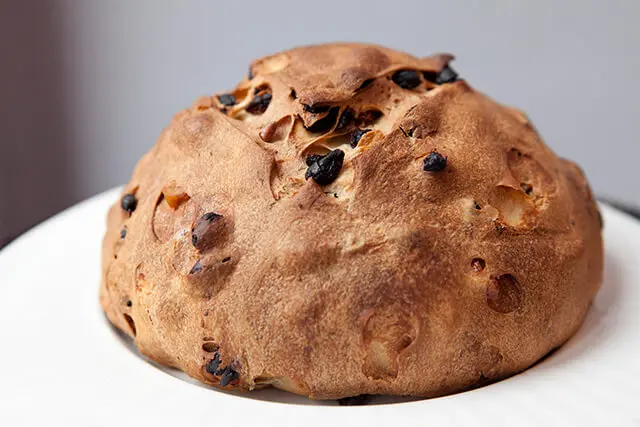 Può essere basso o alto a seconda del tempo di lievitazione ma in entrambi i casi l’impasto è arricchito da pinoli, uvetta e frutta candita.
