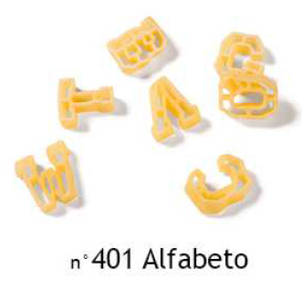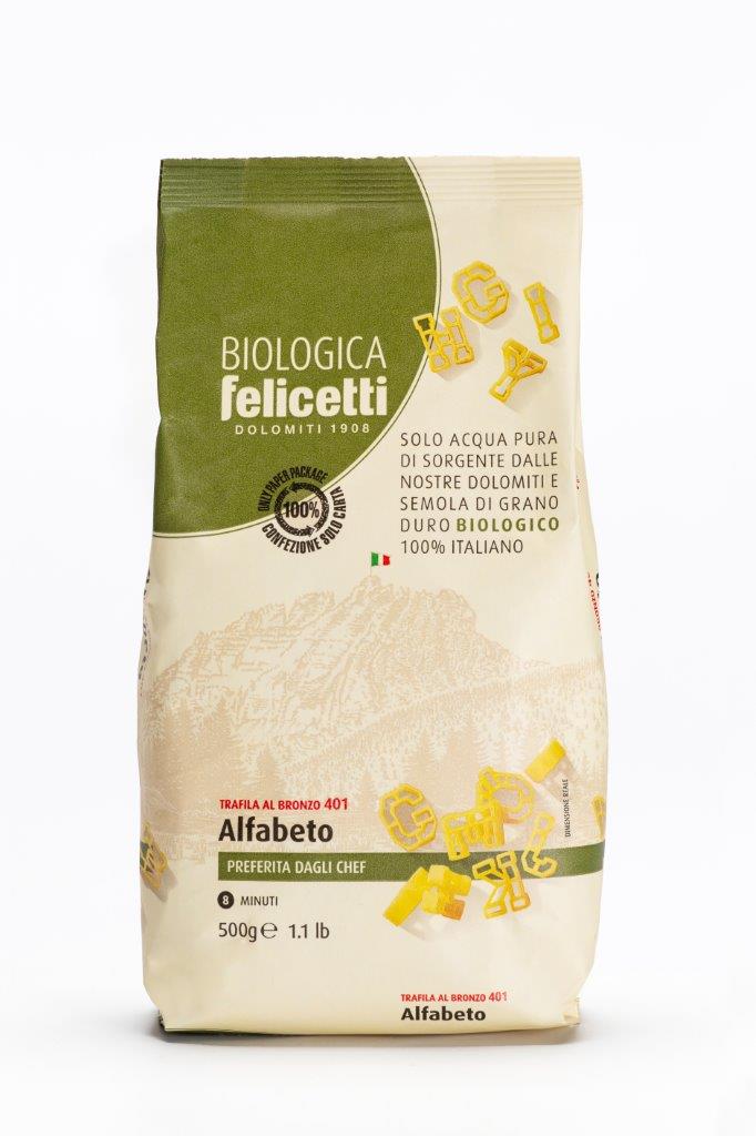 La Pasta biologica fatta solo con semola di grano duro biologico italiano e acqua di sorgente delle Dolomiti. Alfabeto n° 401.