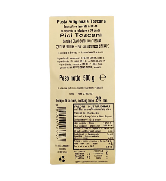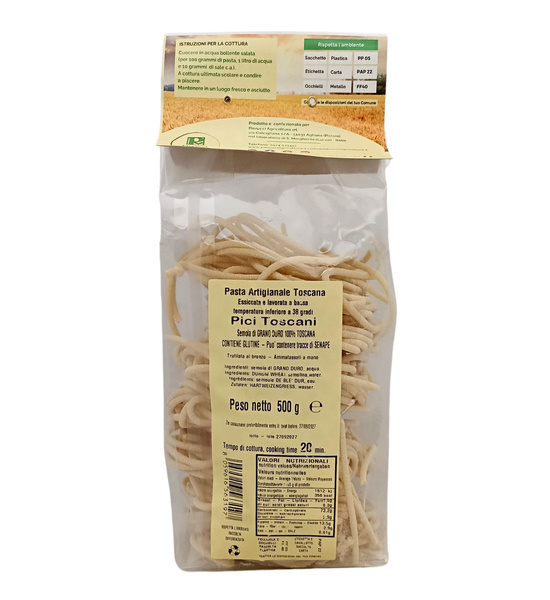 Pasta artigianale toscana essiccata e lavorata a bassa temperatura inferiore a 38 gradi.