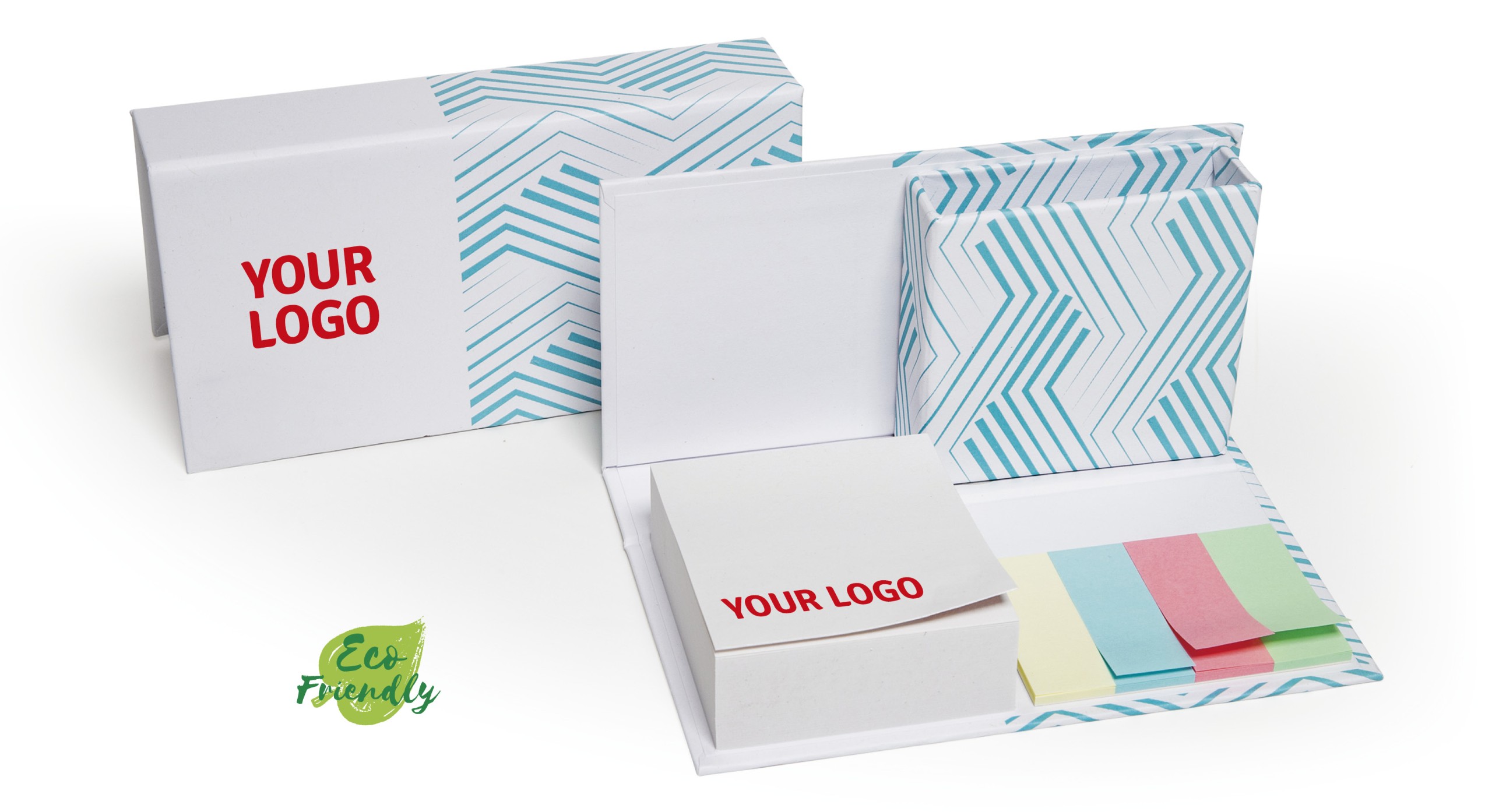Set da scrivania apribile realizzato con copertina rigida in carta riciclata , mm 160x80x30, con portapenne, personalizzato in quadricromia. Al suo interno un blocchetto in carta riciclata adesiva 68x75mm da 25 fogli, 250 fogli in carta riciclata mm 68×65 e un set 5 marcatori in carta neutri 15×45 mm con 25 fogli. Minimo 250 pezzi in polybag singola. Consegna ca 20 giorni da approvazione bozza
